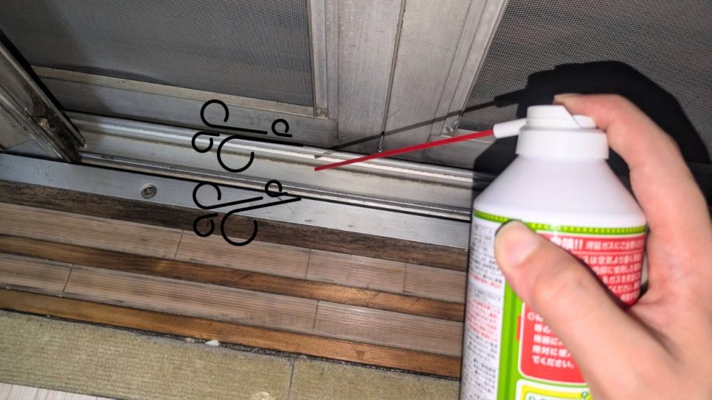 写真のような、窓のサッシの溝やスライドレールのホコリ。雑巾では届かない場所でも、ノズルを差し込んで片手でサッと吹き飛ばせるので、掃除のハードルがぐっと下がります